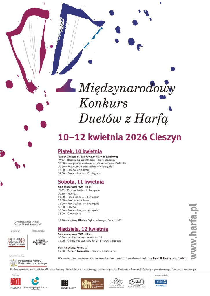 Centrum Edukacji Artystycznej w Warszawie i Polskie Towarzystwo Harfowe dopiero 06.03.2026 r. podpisało Umowę o współorganizacji 11 Międzynarodowego Konkursu Duetów z Harfą w Cieszynie. Regulamin konkursu, w stosunku do publikowanego jesienią 2025 r, uległ nieznacznym zmianom. CEA zdecydowanie zaleciło rozszerzenie w kategorii 4 wiek uczestników, bowiem do szkół muzycznych II stopnia (zwanych w skrócie „popołudniowymi”) uczęszczają uczniowie w wieku od 17 do 23 lat. Polskie Towarzystwo Harfowe udostępniło formularze zgłoszeniowe w wersji elektronicznej, a to przyspieszy rejestrację. Rejestracja jest zamykana zgodnie z regulaminem 22.03.2026 r.